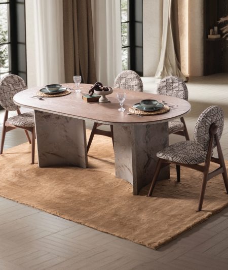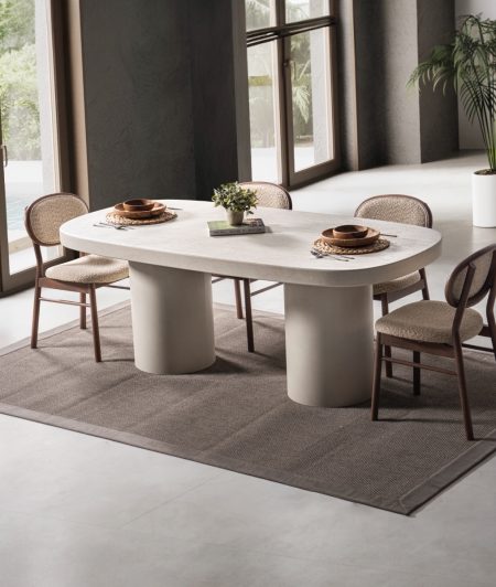 Yemek odasında estetik ve fonksiyonelliği bir arada arayanlar için özel olarak tasarlanan Aura Masa Takımı, modern dekorasyon anlayışına mükemmel uyum sağlar. Ahşap üzeri beton efektli yüzeyi, hem dayanıklılık hem de farklı bir dokusal görünüm kazandırır.